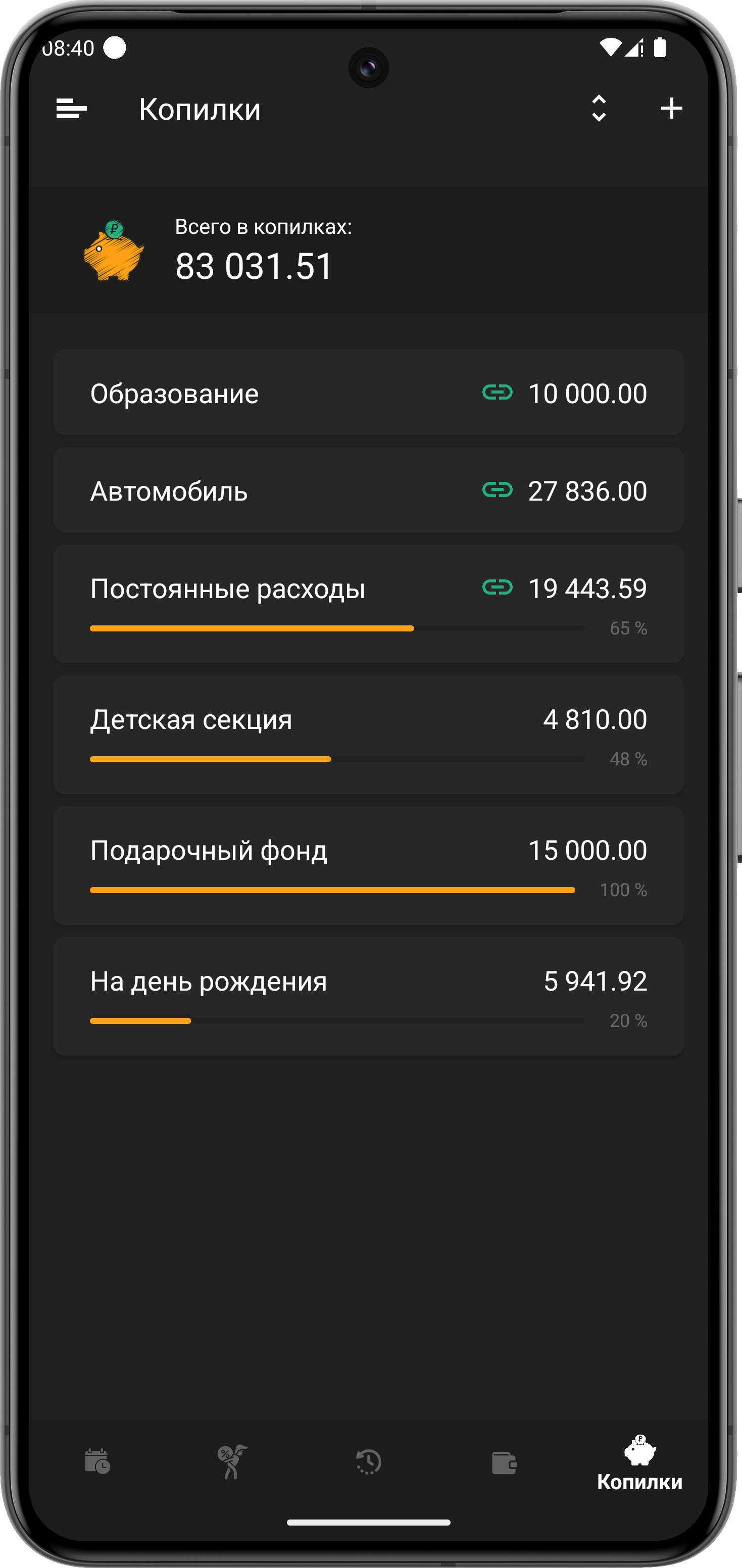 Создавайте резервные фонды для непредвиденных ситуаций. Приложение поможет вам грамотно откладывать и планировать для создания финансовой подушки.